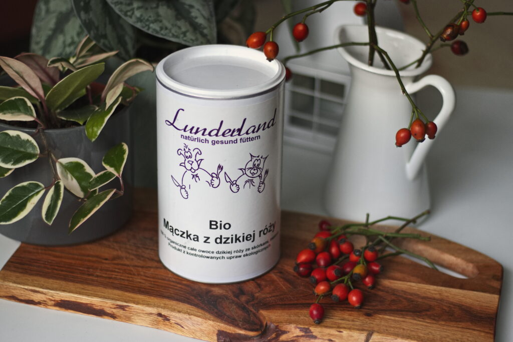 Mączka z dzikiej róży – naturalne źródło witaminy C, wspiera regenerację i produkcję kolagenu.